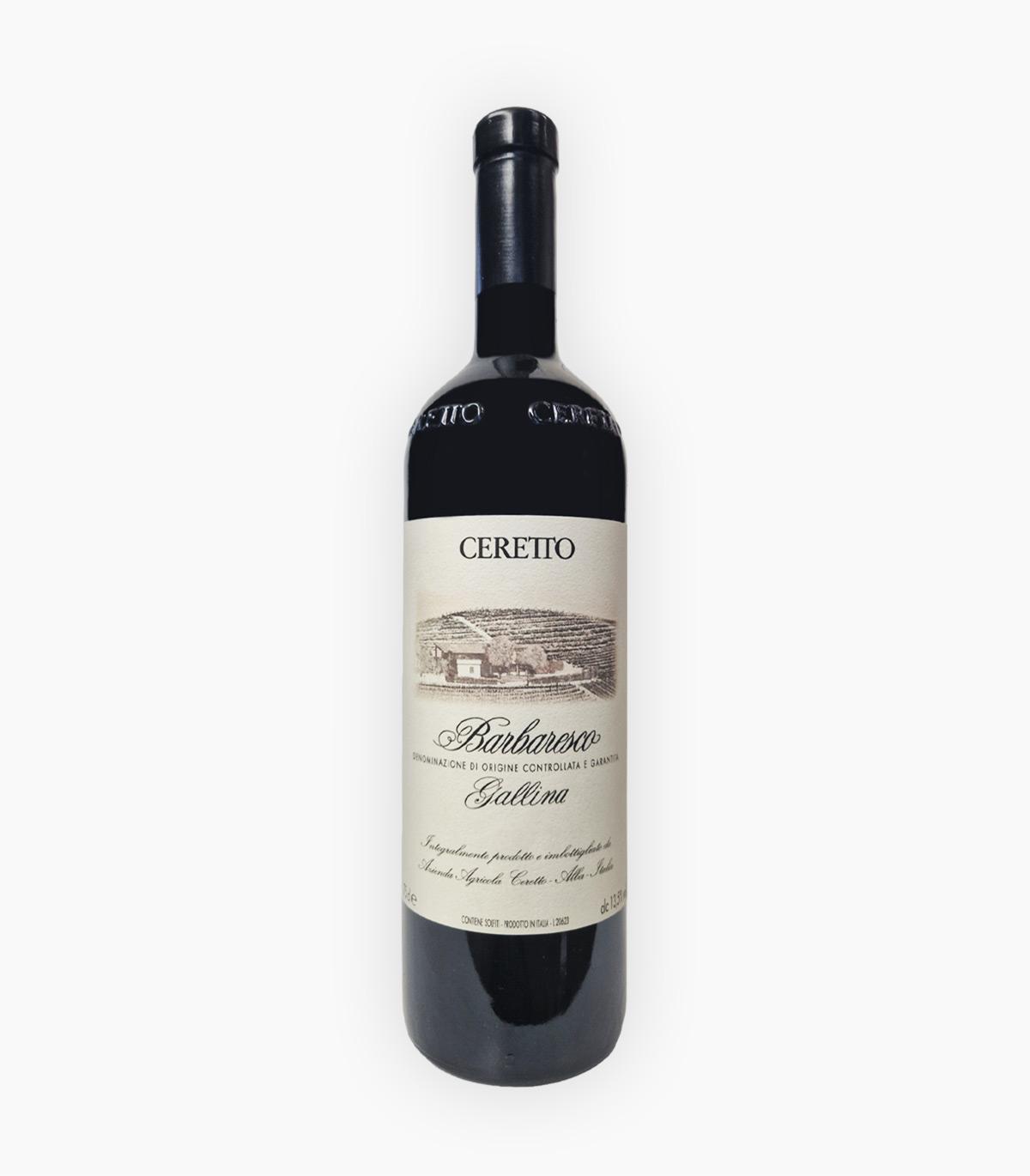 Barbaresco Gallina di Ceretto nasce dalle migliori uve Nebbiolo provenienti dall’omonimo Cru, situato ai piedi di Neive, paese in provincia di Cuneo. Il vino riposa per 2 anni in botti di rovere, per poi rimanere almeno altri 6 mesi in bottiglia.